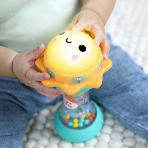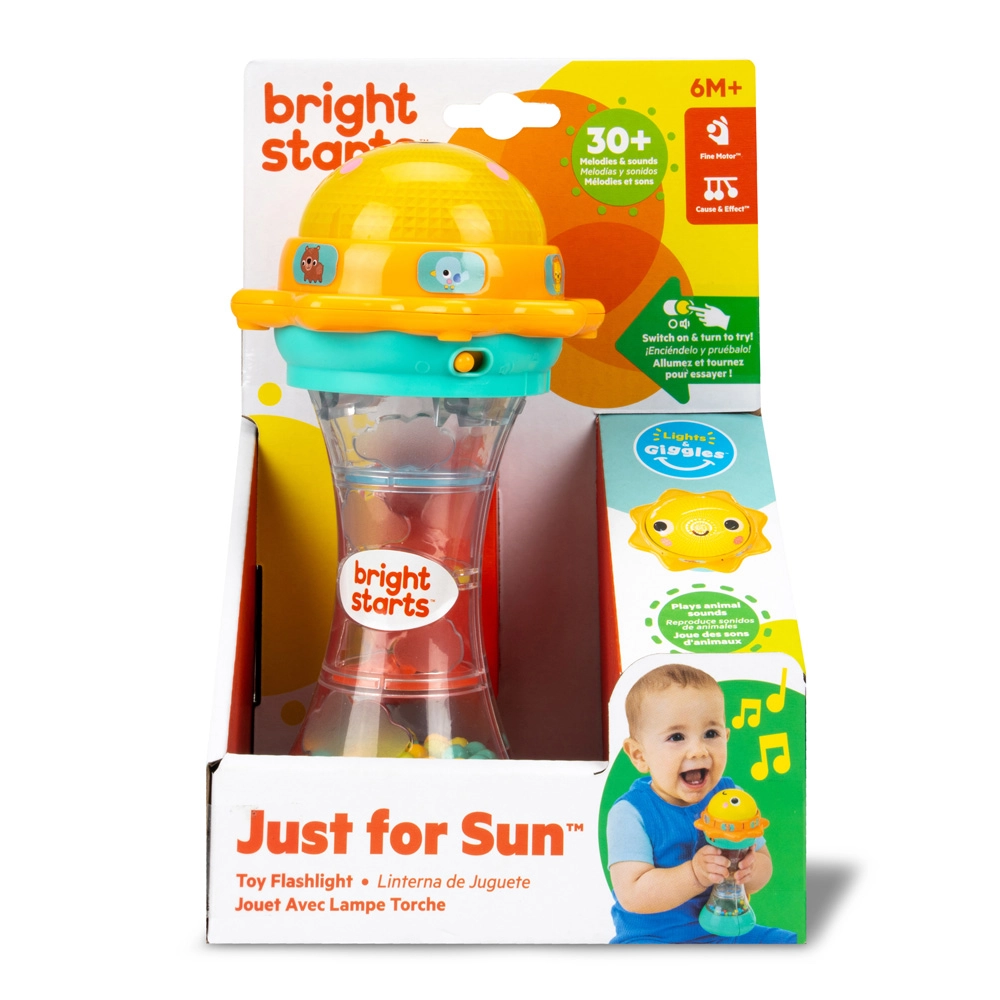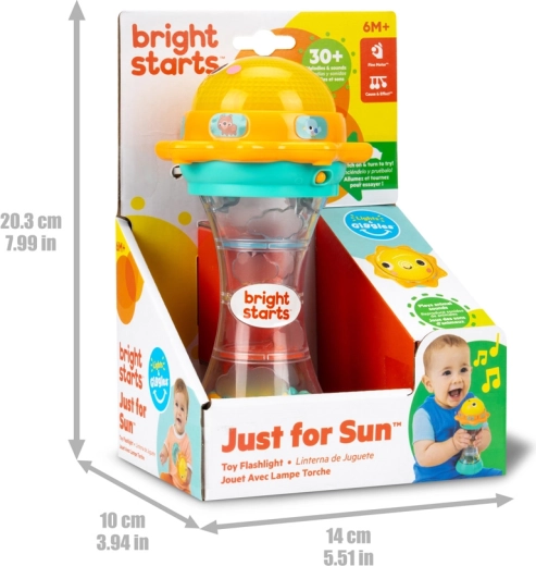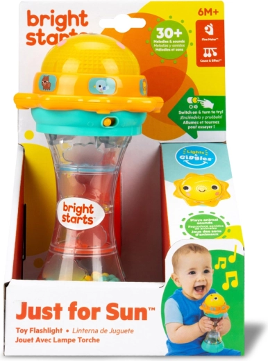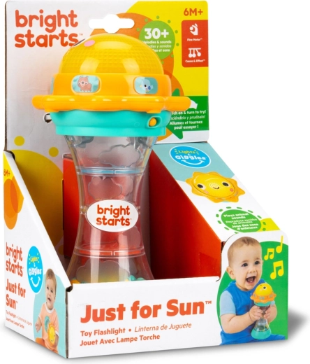 Just for Sun je veselá hračka pro batolata, která spojuje světla, zvuky a pohyb do jedné poutavé aktivity. Děti zaujme svítící kopule ve tvaru sluníčka, která při otočení přehraje více než 30 melodií a zvuků (kočka, medvěd, žába, opice, ptáček, lev). Při zatřesení se barevné kuličky v průhledné komoře rozkutálejí a vytvoří uklidňující efekt dešťových kapek.