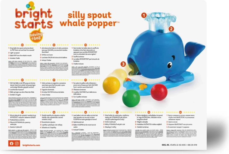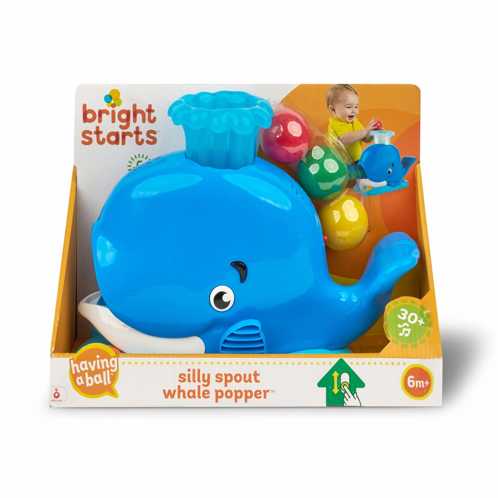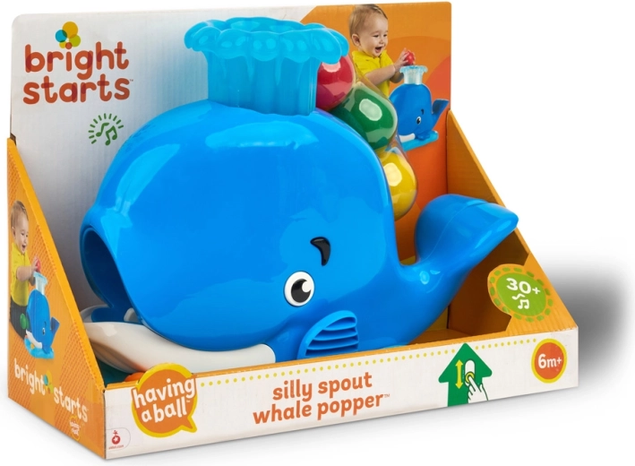 Hudební a světelná velryba Popper od BRIGHT STARTS je ideální interaktivní hračka pro nejmenší. Děti si zamilují honění vyskakujících míčků, zatímco je doprovází více než 30 melodií a zábavných zvuků a barevná světýlka. Jednoduché ovládání podporuje samostatné objevování a prodlužuje dobu hry.