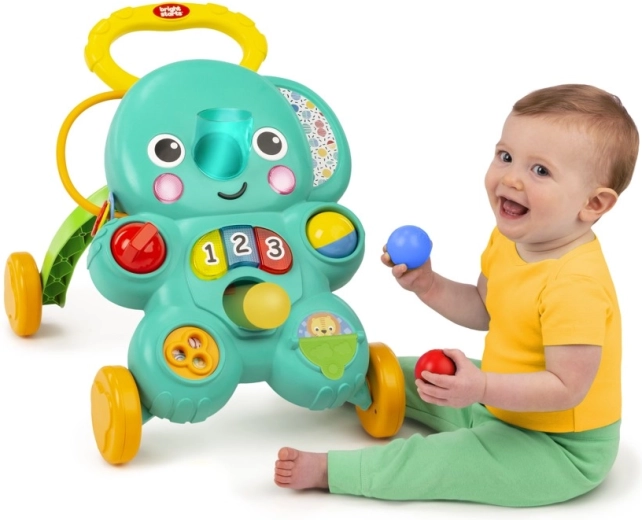Chodítko BRIGHT STARTS Stroll’n Roll 2v1 přináší dětem radost ze hry i sebevědomí při prvních krůčcích. V režimu sezení děti objevují piano klávesy s počítáním 1–2–3, otáčecí prvky, chrastítka a knížku; v režimu chodítka je motivují světla a zvuky aktivované pouštěním míčků chobotem slona.