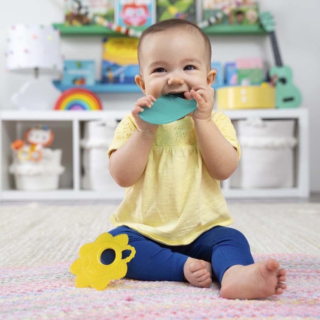 Kousátka Bright Starts Sunny Soothers ve tvaru květu a „pádla“ jsou navržena pro pohodlné držení malými ručkami a cílenou úlevu při prořezávání zoubků. Různé textury a štětinky jemně masírují dásně a pomáhají miminku uklidnit se během náročného období.