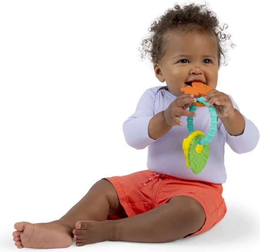Kousátko Bright Starts Tropical Chews je navržené pro pohodlí i radost miminek od 3 měsíců. Barevné tvary a rozmanité povrchy pomáhají zklidnit bolavé dásně a zároveň podporují smyslovou stimulaci a jemnou motoriku. Lehká konstrukce a ergonomický silikonový kroužek zaručují jistý úchop i těm nejmenším.