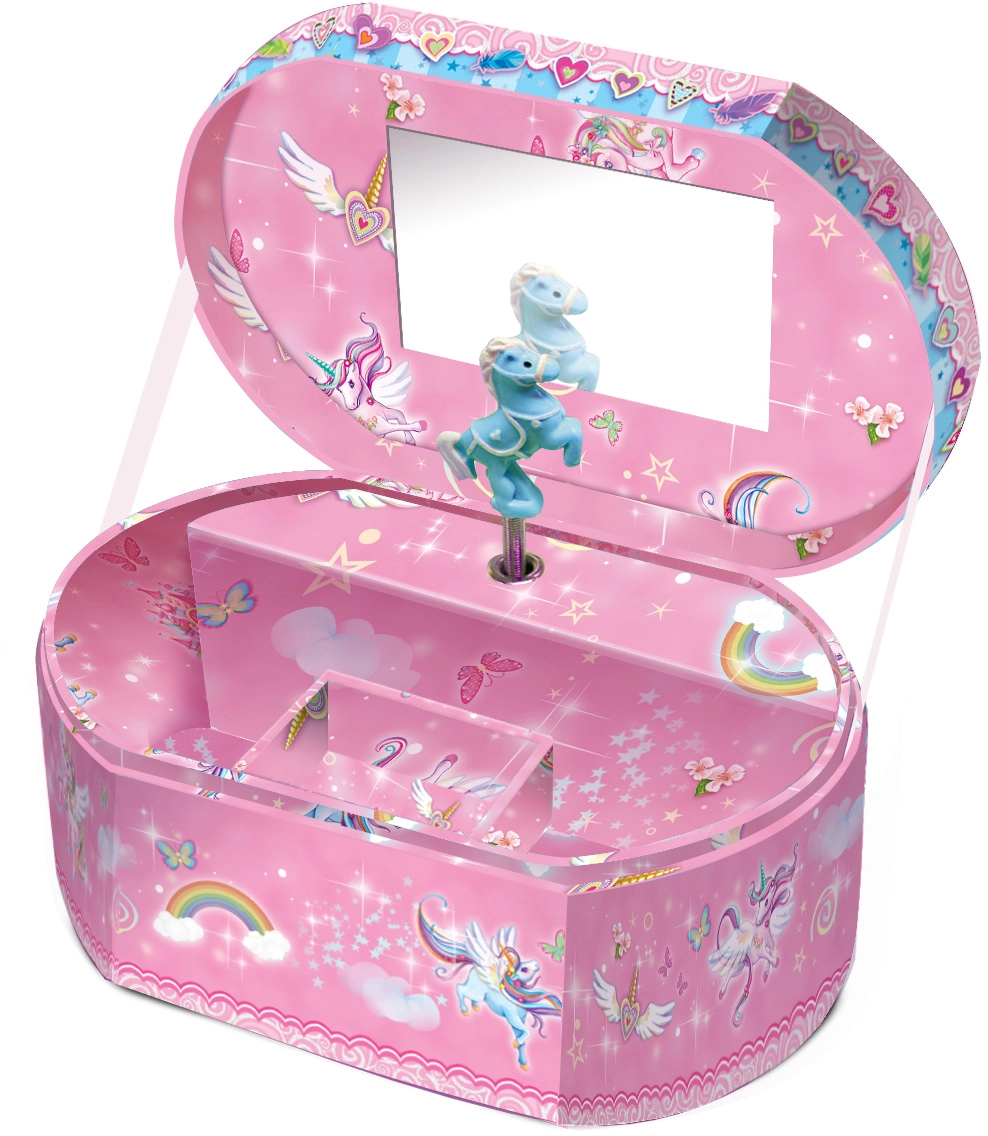 Kouzelná oválná šperkovnice s motivem jednorožce potěší každou malou princeznu. Po otevření zahraje krásnou melodii, nabídne dostatek prostoru pro náušnice, náramky a drobné poklady a stane se okouzlující dekorací dětského pokoje.