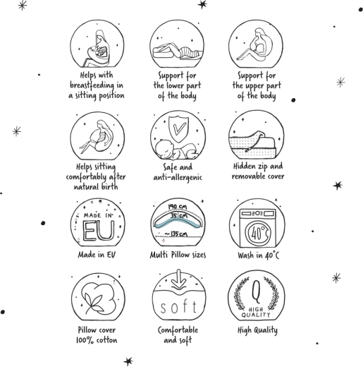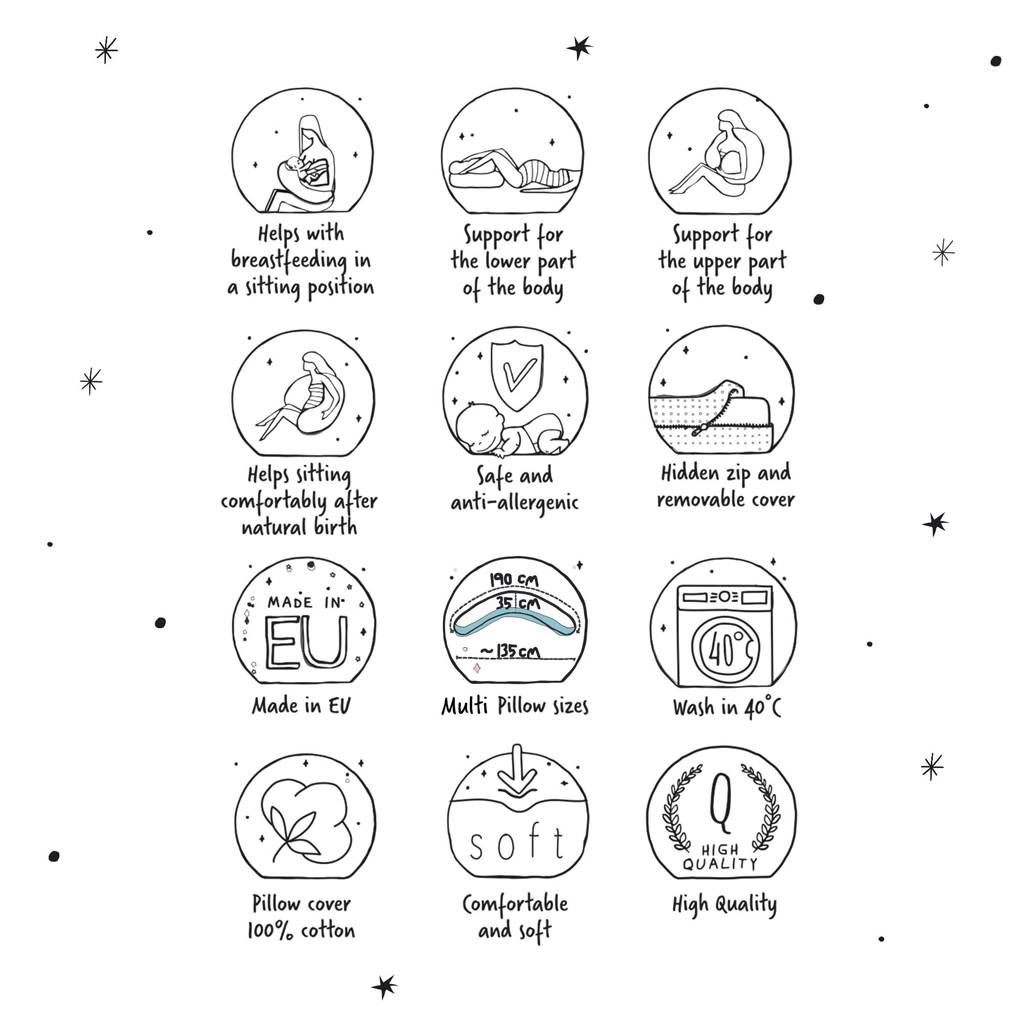 Cebuška Multi je promyšlený polštář pro období těhotenství, šestinedělí i kojení. Výplň z polystyrenových mikroperliček (0,5–1,5 mm) se plynule přesýpá podle polohy těla, jemně masíruje a pomáhá udržet správné držení zad. Povrch z měkkého žerzeje je příjemný na dotek a šetrný k citlivé pokožce maminky i miminka.