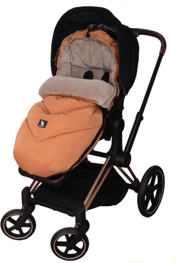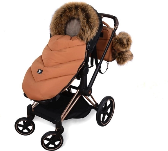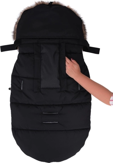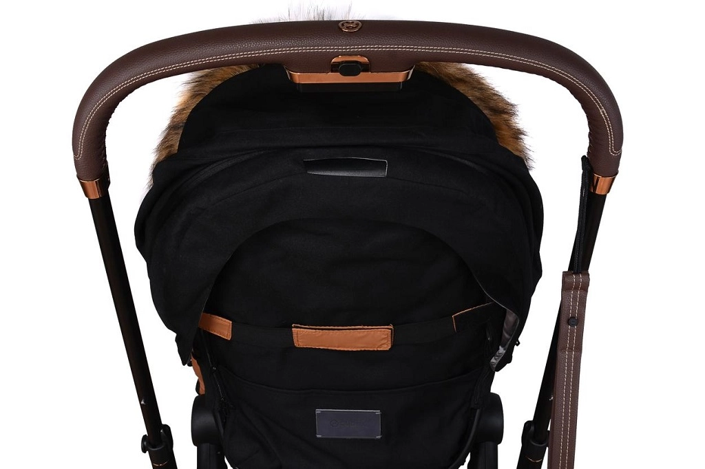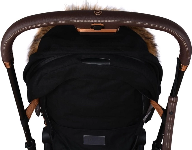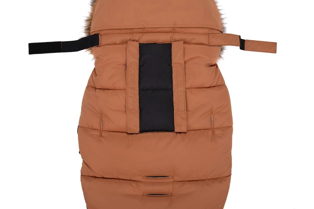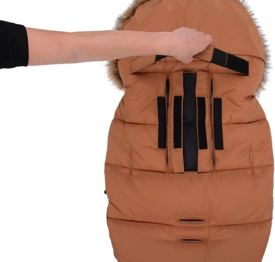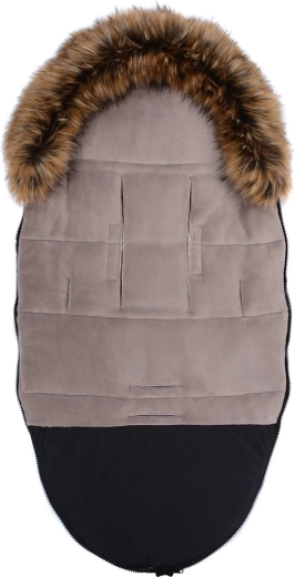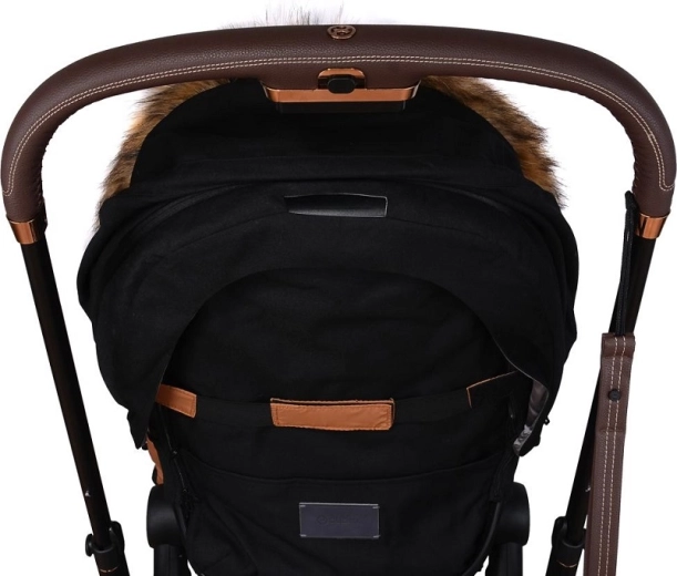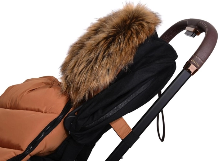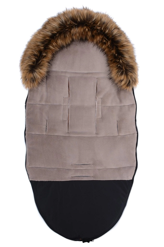 Praktické zapínání na zip umožňuje rychlé oblékání a větrání, přední díl lze po obou stranách zcela odepnout. Díky otvorům pro 5bodový pás a zadnímu popruhu pro upevnění na opěradlo drží fusak pevně na místě v různých typech kočárků. Stylový vzhled doplňuje odnímatelná umělá kožešina na kapuci.