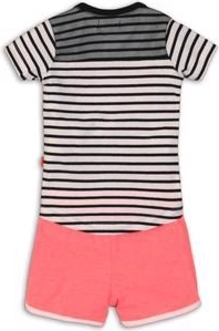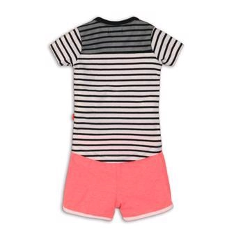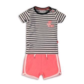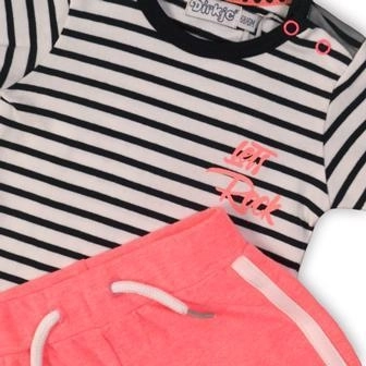 Oblékněte své dítě do pohodlí a stylu se setem DIRKJE, který kombinuje praktičnost a roztomilý design. Pruhované tričko v bílo‑černé barvě s drobným růžovým motivem doplňují růžové šortky s bílým lemem. Díky měkké bavlně a příměsi elastanu se oblečení krásně přizpůsobí a neomezuje v pohybu.