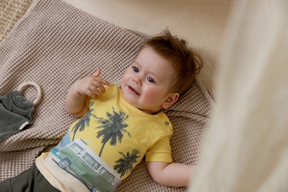 Užijte si léto každý den s lehkým a příjemným tričkem pro malé dobrodruhy. Žlutý odstín a hravý plážový motiv dodávají outfitu svěží look, zatímco měkký úplet s příměsí elastanu zaručí volnost pohybu a pohodlí po celý den.