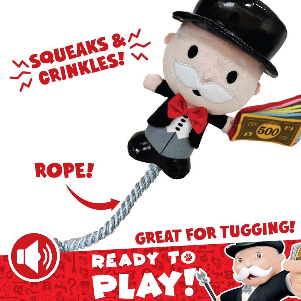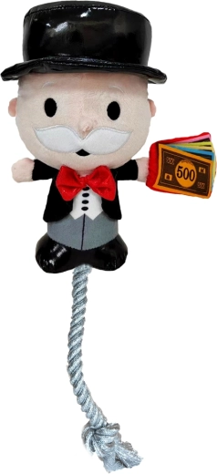 Tato oficiálně licencovaná plyšová hračka s ikonickou postavičkou z hry MONOPOLY spojuje měkký dotyk a odolné provedení. Je ideální pro přetahování, aportování i samostatné hraní. Díky kombinaci plyše a spleteného lana zvládá jemnou až střední intenzitu zátěže a zároveň je příjemná na kousání.