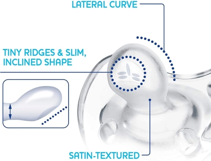 Díky zúžené a pružné krčce savičky dítě snadno zavře ústa a snižuje se riziko nerovnoměrných zubních oblouků. Celosilikonová konstrukce je ideální i na spánek a pohodlná pro každodenní použití. Praktické zadní držadlo umožňuje jemné přidržení nebo připnutí na univerzální klip.