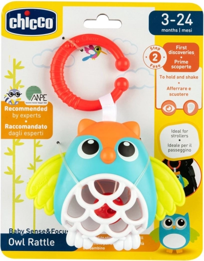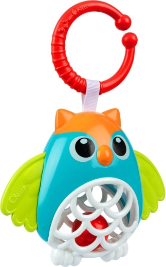Chicco sova na C kroužku je barevná chrastítková hračka, která zaujme miminko zvukem, tvary i kontrastními barvami. Měkké části jsou šetrné k dásním a rukojeť i tělo hračky se snadno drží. Díky univerzálnímu kroužku ji rychle připevníte na kočárek, autosedačku nebo postýlku.