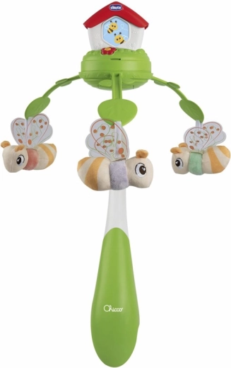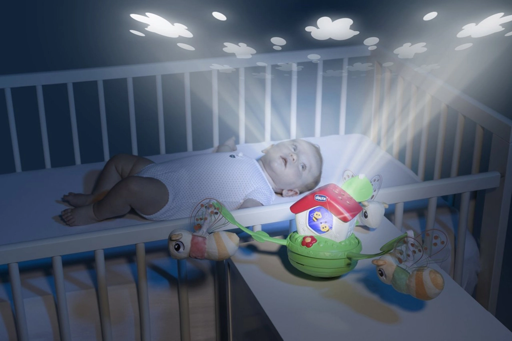 CHICCO Bee Hive 3v1 roste s vaším děťátkem – od novorozence po batole. Jako kolotoč vytváří nad postýlkou uklidňující světelné projekce a jemně rotující textilní včelky, které podporují vizuální vnímání a pomáhají usínání. Po odejmutí ramene funguje jako samostatný projektor vedle postýlky a později se promění v aktivní centrum – miminko si může hrát s odnímatelnými včelkami a úlem.