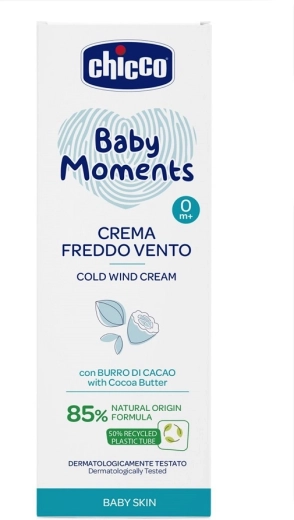 Jemný ochranný krém CHICCO Baby Moments chrání citlivou dětskou pokožku před chladem a větrem. Jeho receptura s 81 % přírodních složek, kakaovým a bambuckým máslem, panthenolem a Omega-3 oleji posiluje kožní bariéru a zanechává pleť hebkou a vyživenou. Bez parabenů, barviv a alkoholu, s jemnou vůní Baby Moments. Dermatologicky i oftalmologicky testováno, vhodné od narození.