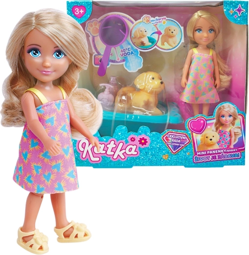 Sada Panenka Katka se psem a vanou potěší každou malou pečovatelku. Panenka má dlouhé vlasy vhodné k česání a barevný obleček, psí kamarád vybízí k vymýšlení příběhů a vana v veselých barvách doplní koupací rituály panenky. Díky kvalitním materiálům je hra bezpečná a odolná pro každodenní používání.