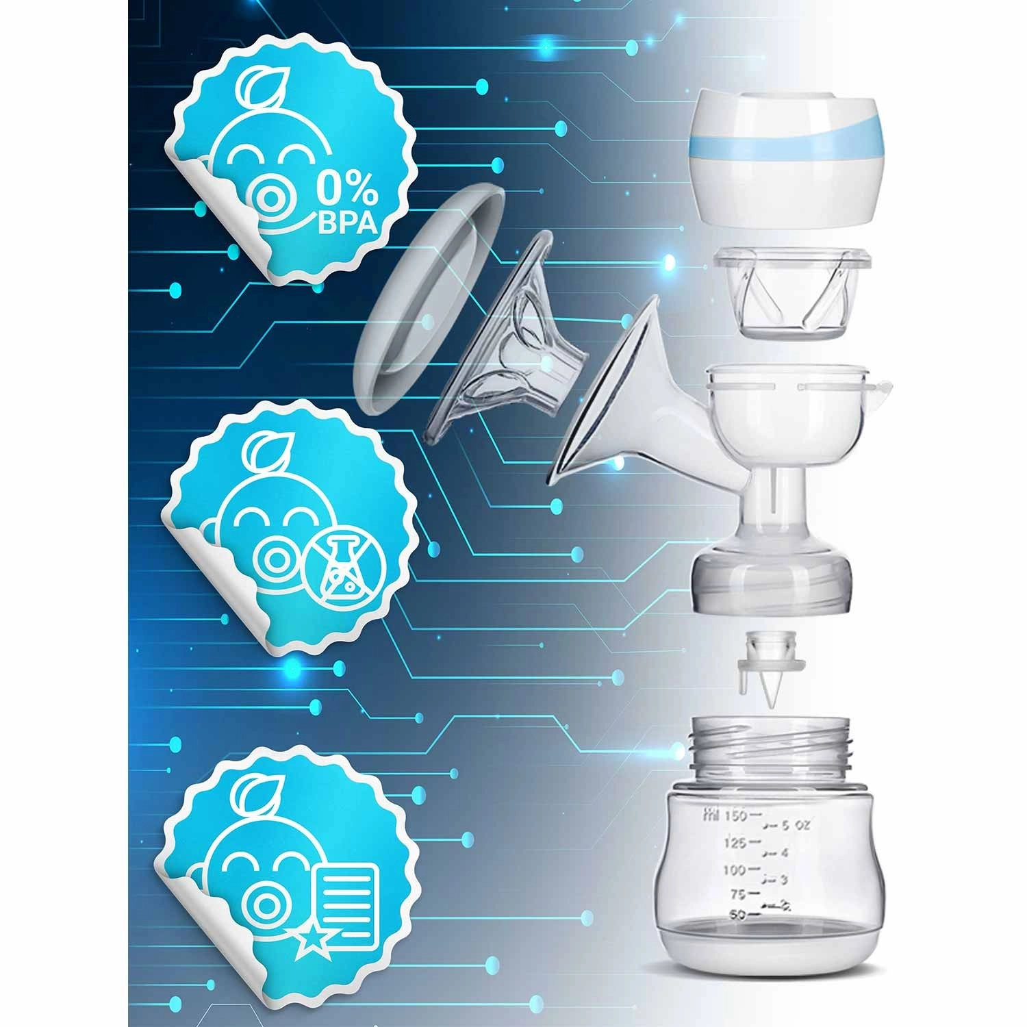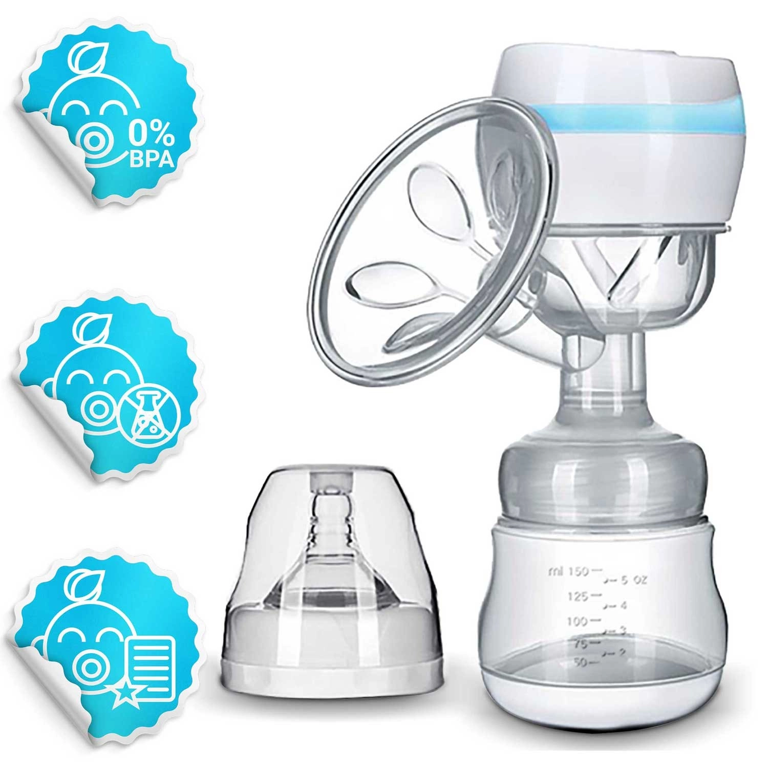 V balení najdete láhev 150 ml s ryskou a praktické uzavíratelné sáčky na mléko (2 ks) pro hygienické skladování. Odsávačka splňuje bezpečnostní normy a certifikace CE, LFGB, RoHS, REACH.