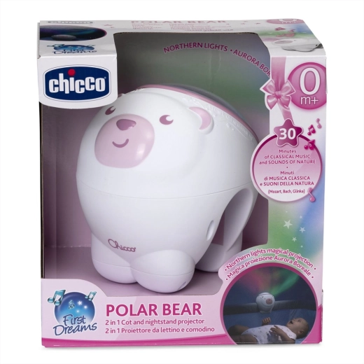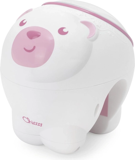 Chicco projektor polární záře v roztomilém designu medvídka vytváří příjemnou atmosféru pro večerní zklidnění a spánek. Barevná, dynamická projekce připomínající polární záři promění dětský pokoj v kouzelné místo, zatímco vybrané melodie Mozart, Bach, Glinka a uklidňující zvuky přírody pomohou miminku snadněji usnout.