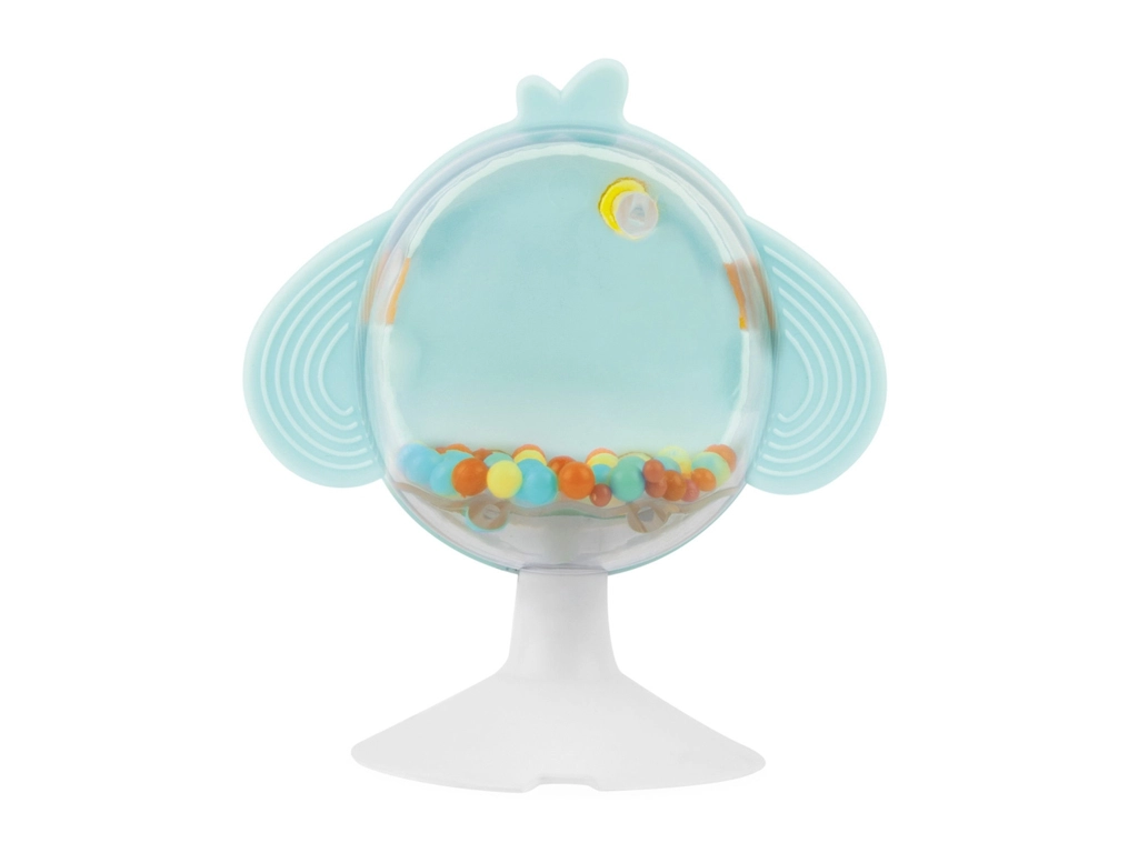 Stabilní přísavka udrží hračku na tácu židličky. Texturovaná křídla z měkkého plastu zklidňují dásně, barevné kuličky v těle podporují sluchovou a zrakovou stimulaci.