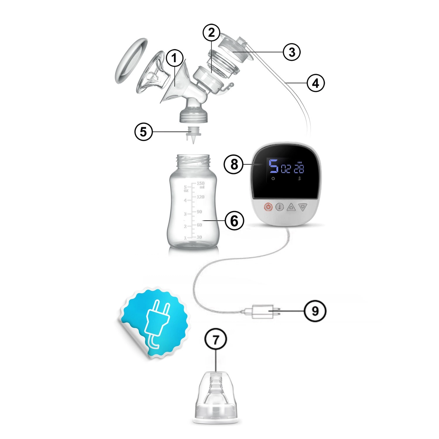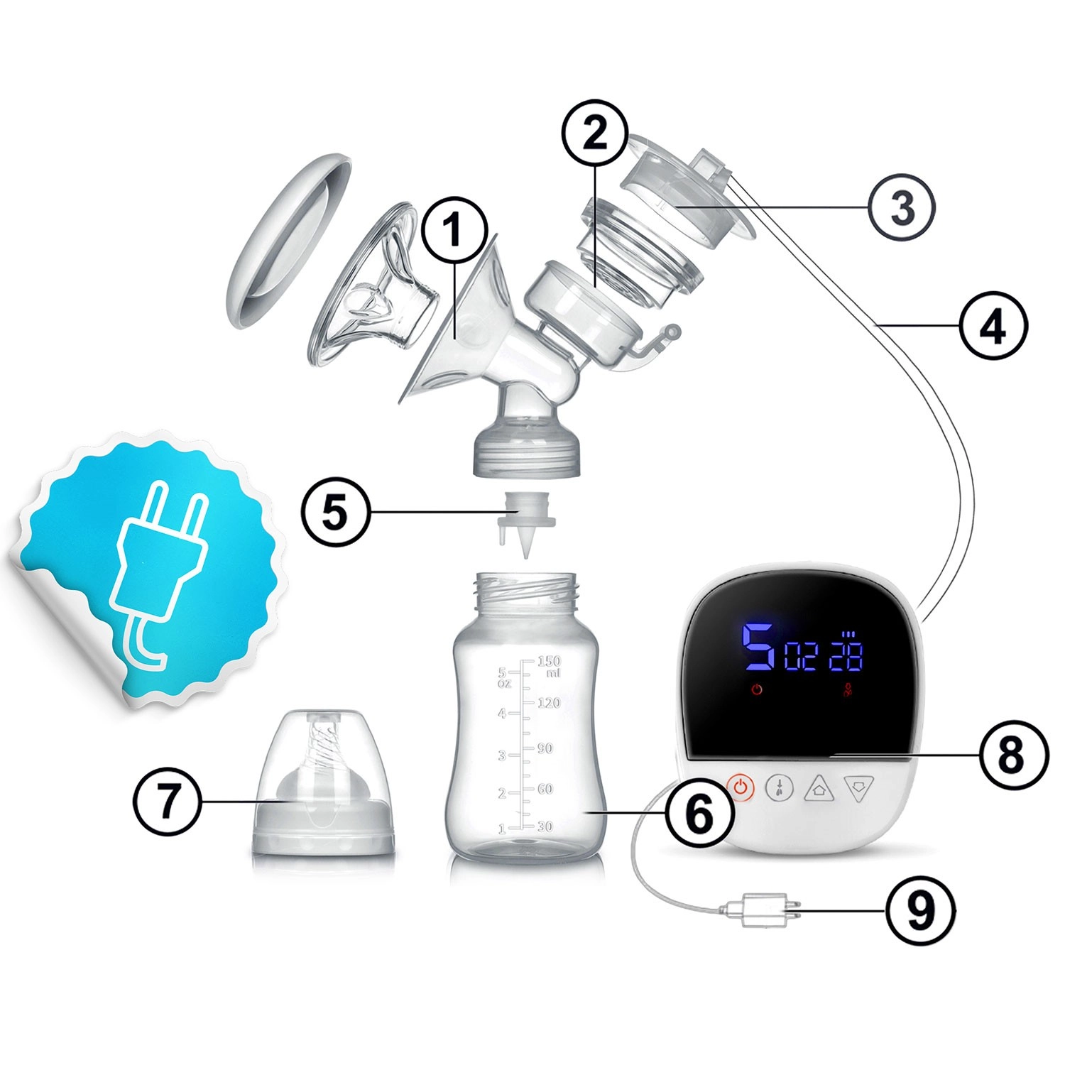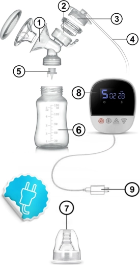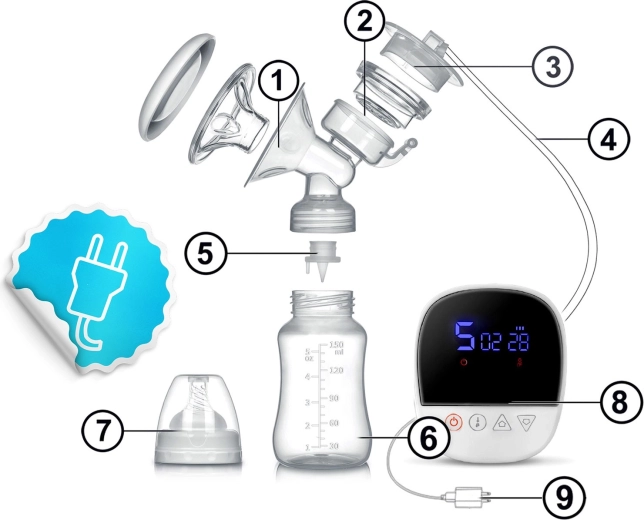 Zařízení je bezdrátové s odolnou baterií, velmi tiché a ideální na cesty. Intuitivní panel s displejem zobrazuje čas, režim, úroveň sání a stav baterie. Všechny části, které přicházejí do styku s mlékem, jsou bez BPA a splňují normy CE, LFGB, RoHS, REACH. Rychlé rozložení a čištění vám usnadní každodenní hygienu a udrží vysoký standard bezpečí pro vás i vaše miminko.