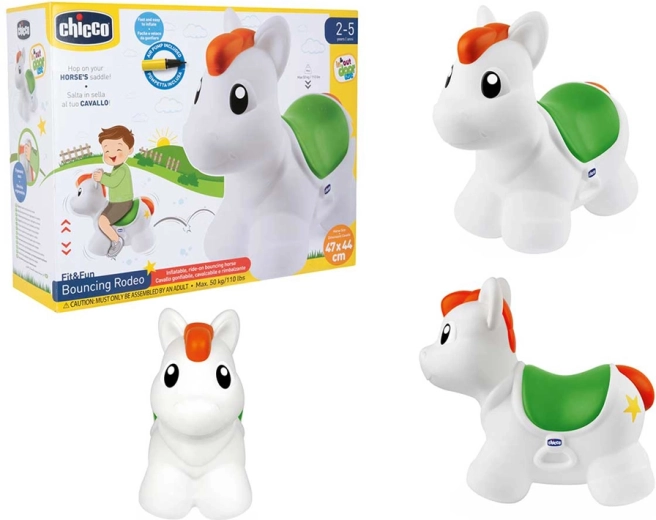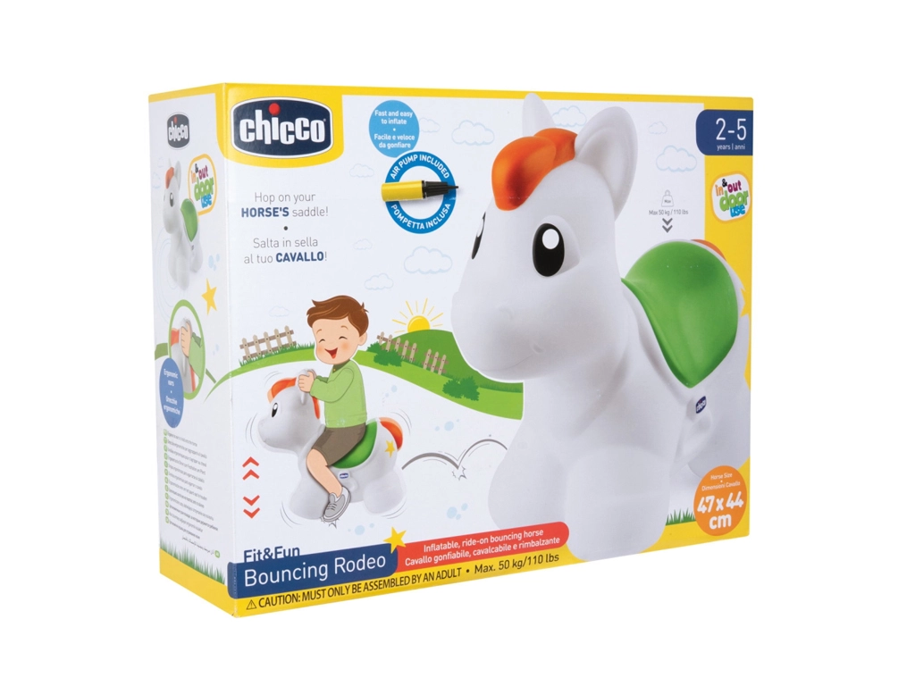 Nafukovací skákací koník CHICCO Rodeo je ideální parťák pro první skákání a odrážení. Díky hladkým tvarům, zaobleným hranám a ergonomickému sedátku je sezení pohodlné a jízda stabilní. Skákadlo se snadno a rychle nafoukne pomocí přiložené ruční pumpy, takže je připravené ke hře během chvilky.