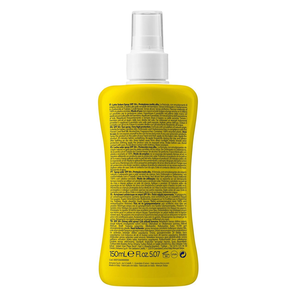 Opalovací sprej Chicco byl vyvinut speciálně pro potřeby citlivé dětské pokožky. Díky velmi vysokému faktoru SPF 50+ a fotostabilním filtrům efektivně chrání před UVA, UVB i infračerveným (IR) zářením. Snadno se aplikuje, rychle se vstřebává a nezanechává mastný film.