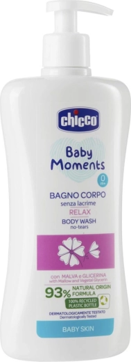 Chicco Baby Moments Relax je každodenní péče pro miminka a děti od 0 měsíců. Jeho ultra jemné složení „no tears“ šetrně čistí tělíčko i vlásky bez štípání očí, respektuje hydrolipidovou bariéru a pomáhá udržet přirozenou vlhkost pokožky.
