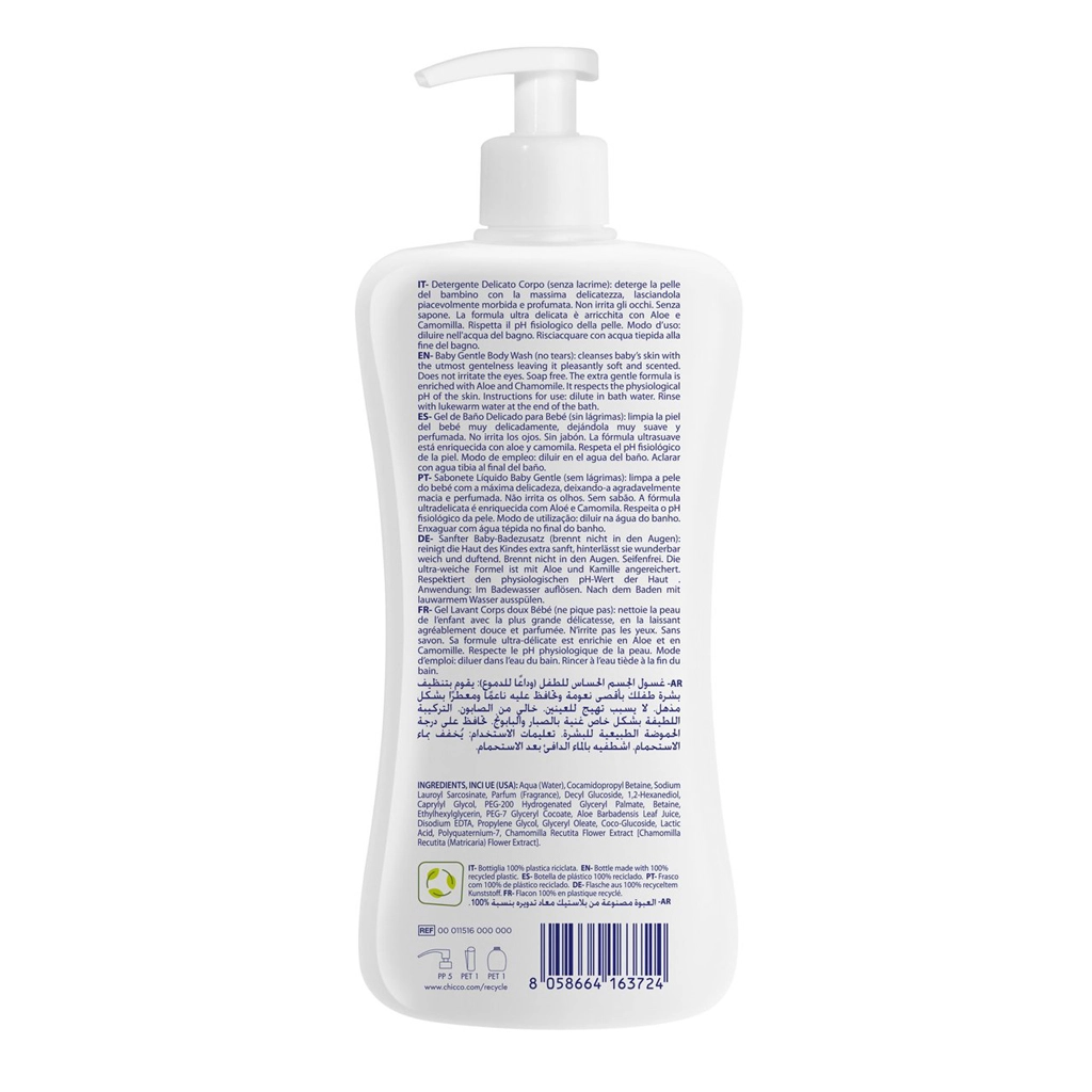 Jemný sprchový gel Chicco Natural Sensation je určen pro každodenní mytí citlivé dětské pokožky již od narození. Je dermatologicky a pediatricky testovaný, respektuje přirozené pH a zanechává kůži hebkou a příjemně provoněnou. Obsahuje aloe vera pro hydrataci a zklidnění a heřmánek pro zjemnění. Vyrobeno v Itálii, velké balení 500 ml pro praktické použití.