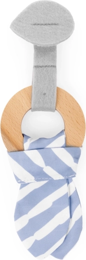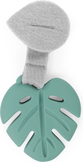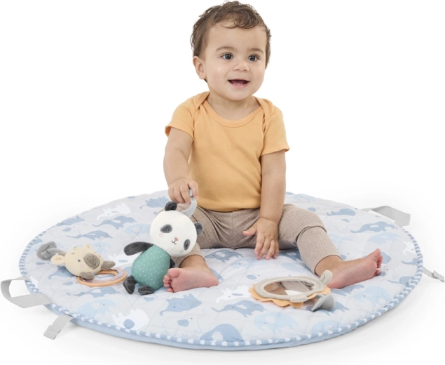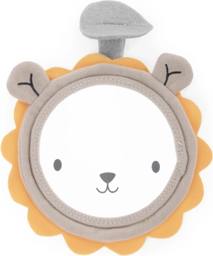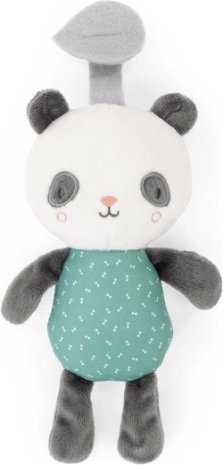 Silikonové kousátko ve tvaru lístku, plyšová panda, dřevěný kroužek, bezpečné zrcátko s lvíčkem a chrastítko se žirafou motivují k uchopování a zkoumání.
