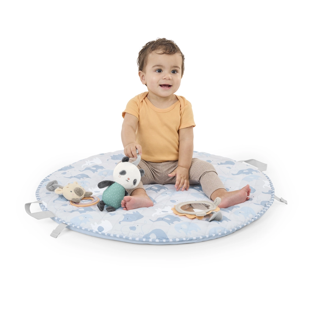 Podporuje přirozený rozvoj od prvních dnů: pohodlné ležení, posilující tummy time s podpůrným polštářkem a bezpečné sezení s hračkami na dosah.
