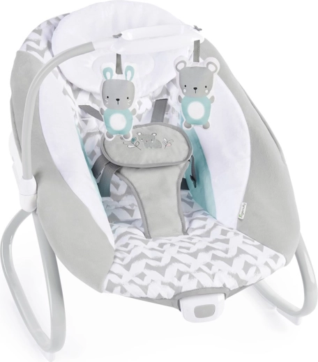 O pohodlí se stará měkké, plyšové polstrování s vyjímatelnou opěrkou hlavy, bezpečí zajišťuje spolehlivé připoutání a zábavu doplní odnímatelná hrazdička se dvěma hračkami. Praktické USB napájení (kabel 1,83 m v balení) minimalizuje potřebu baterií, sedací vložku i opěrku hlavy lze prát v pračce. Díky skládacímu rámu s kolečky a rukojetí se houpačka snadno přenáší a je ideální do menších prostor i na cesty.