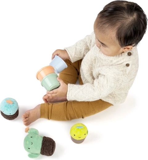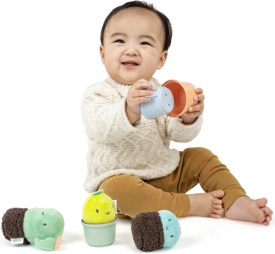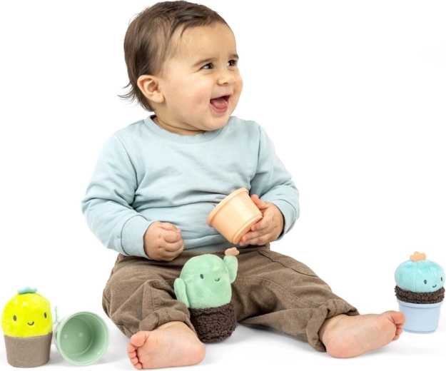 S každým zatřesením přichází jemný zvuk, který podněcuje sluchové vnímání a radost z objevování. Měkké plyšové „kaktusy“ se snadno drží i nejmenším ručkám, hladké hrníčky se dají vkládat do sebe nebo na sebe stohovat. Dítě se tak přirozeně učí principům velikosti, pořadí a prostorové orientace.