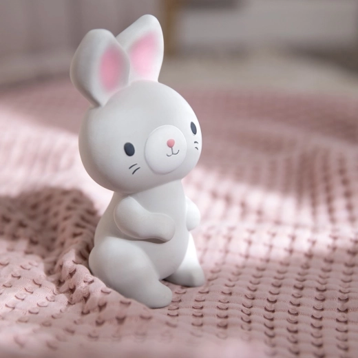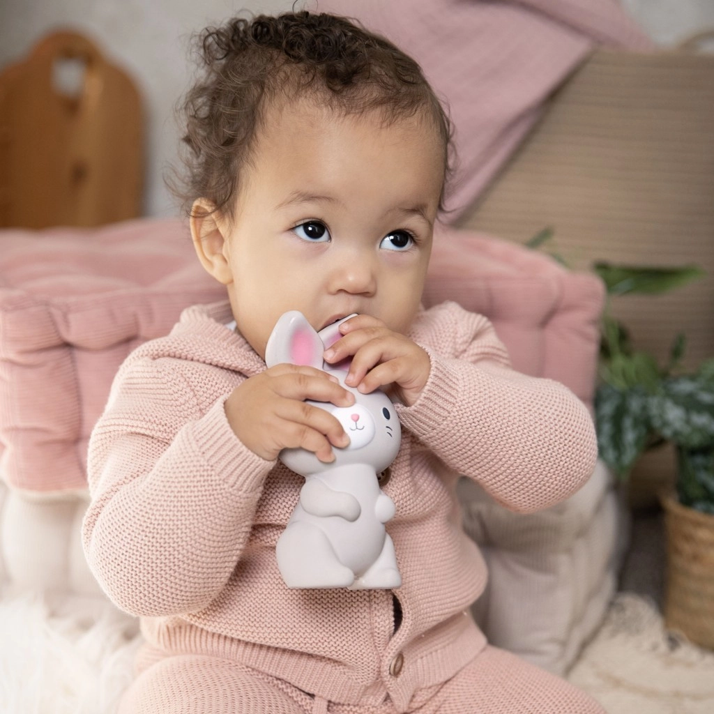 Roztomilé kousátko ve tvaru zajíčka z přírodního kaučuku jemně ulevuje od prořezávání zoubků a zároveň stimuluje smysly díky pískání, texturám a tvaru snadnému k uchopení. Ergonomický design pro nejmenší od 0 měsíců, bezpečné neutrální barvy a měkký, poddajný materiál pro pohodlné mačkání i kousání.