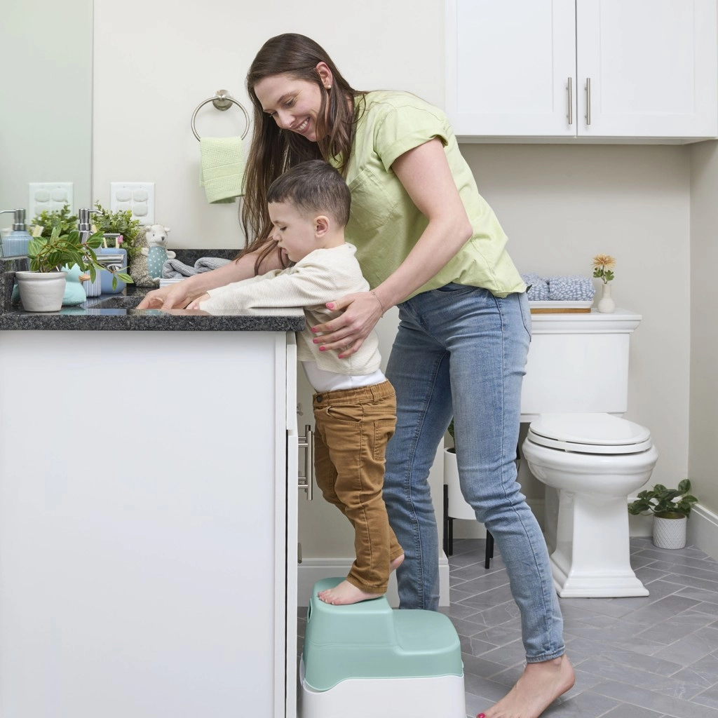 Stabilní dvoustupňová stolička s protiskluzovým povrchem pomáhá dětem bezpečně dosáhnout na toaletu i umyvadlo.