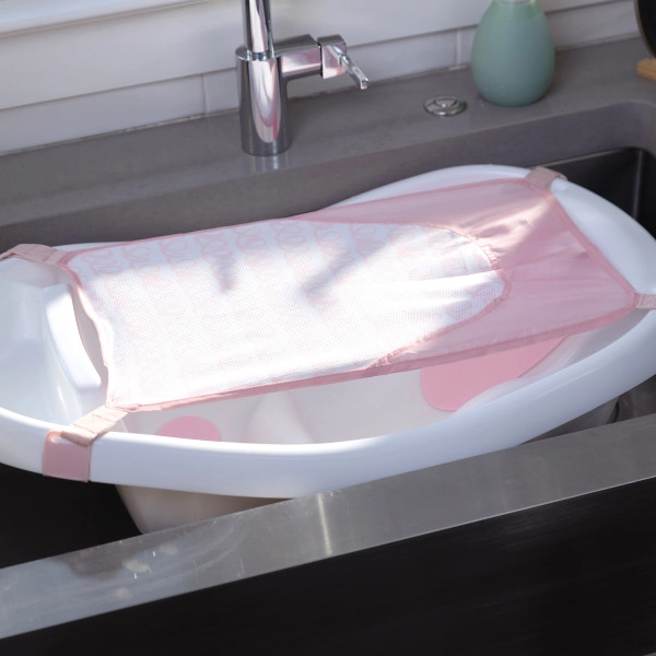 Měkký, prodyšný látkový závěs jemně cradluje miminko a uvolní vám ruce pro pohodlné a bezpečné mytí. Ideální pro první měsíce až do doby, kdy dítě umí samo sedět.