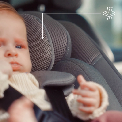 Ochranné systémy H-GUARD (zesílená, trojvrstvá opěrka hlavy s paměťovou pěnou) a SIDE PROTECT účinně absorbují energii nárazu. Reclining System nabídne 4 polohy sklonu, zatímco ventilovaná skořepina a prodyšný potah snižují pocení v horku. EASY GROW umožňuje jednou rukou nastavit opěrku hlavy a pásy (6 pozic). Včetně novorozenecké vložky do 60 cm pro správné usazení miminka.
