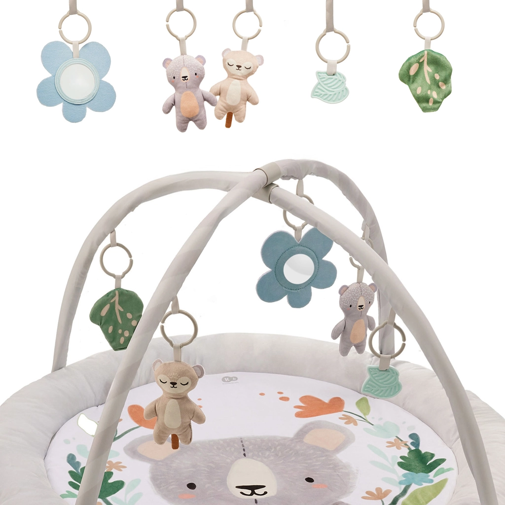 Konfigurujte rozmístění pěti hraček (zrcátko, 2 plyšové hračky, šustící prvek a kousátka) pro optimální stimulaci zraku a motoriky.