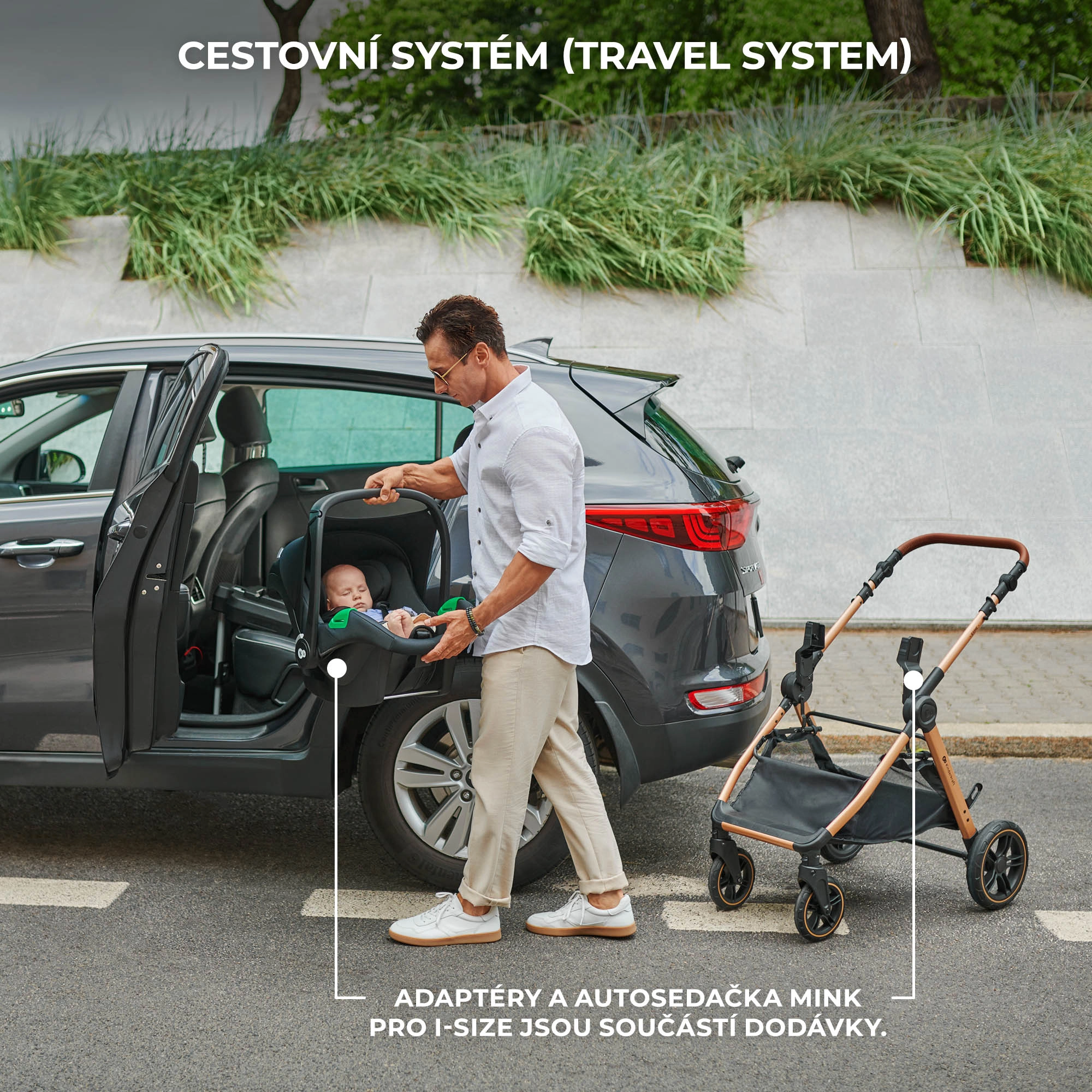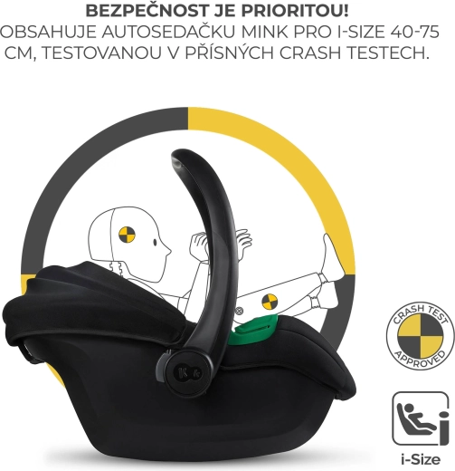 TRAVEL SYSTEM v balení – součástí je autosedačka MINK PRO 2 i-Size (40–87 cm) s adaptéry. Díky ní přenesete spící miminko z auta na rám kočárku bez buzení. O bezpečí se starají systémy H-GUARD+ a SPS+, jízda proti směru (RWF) je až 5× bezpečnější. V balení navíc dostanete držák na nápoj, nánožník, pláštěnku a praktickou tašku.