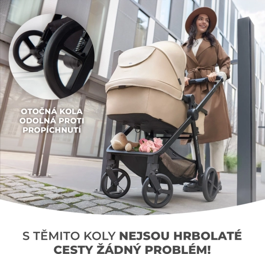 Velká, odpružená kola, která není třeba dofukovat, zvládají městské chodníky i parkové cesty. Nepromokavá stříška s UPF50+ s ventilačním panelem a okénkem ochrání dítě před sluncem, větrem i deštěm. Kočárek se skládá i se sedákem do kompaktního tvaru, takže šetří místo v malém bytě. V balení najdete bohaté příslušenství: nánožník, pláštěnku, adaptéry a autosedačku MINK PRO i-Size pro plynulý přechod z auta na rám kočárku.