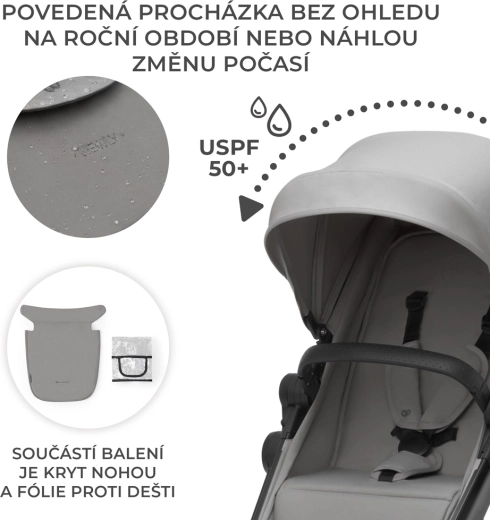 - Ochranná stříška UPF50+ – voděodolná, s okénkem a sluneční clonou.