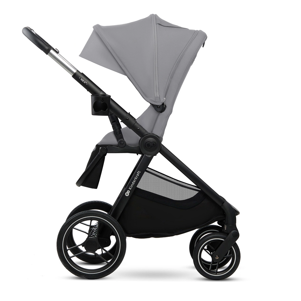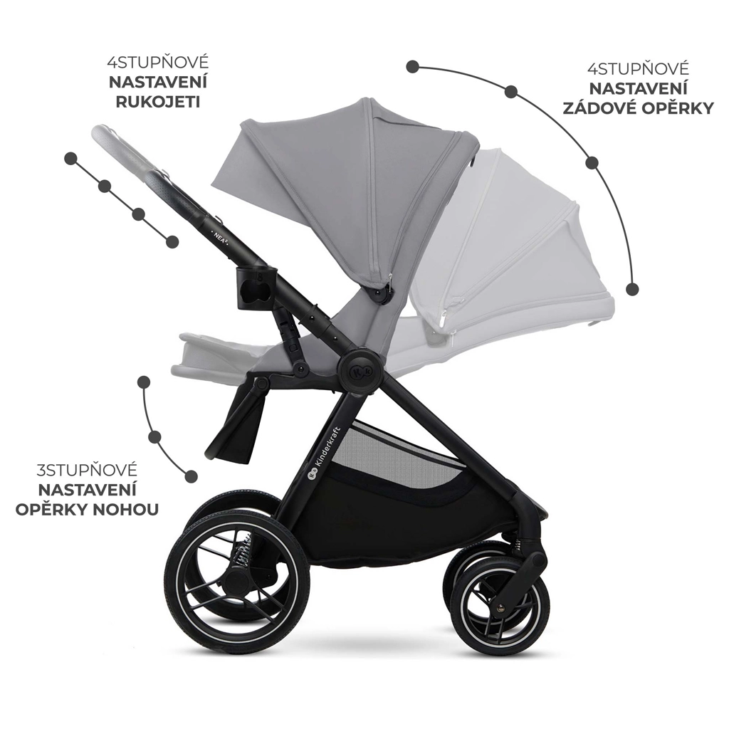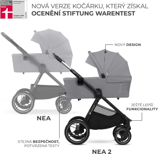 KINDERKRAFT NEA 2 2v1 je promyšlený kočárek do města i mimo něj. Velká, odolná kola s odpružením zvládají obrubníky i nerovné cesty, zatímco lehká konstrukce a teleskopická rukojeť zajišťují pohodlné manévrování. Korbička s měkkou matrací je ideální od narození, sportovní sedadlo pak roste s dítětem až do 22 kg. Stříška s ochranou UPF50+, nepromokavým materiálem, ventilačním panelem a okénkem chrání a zpříjemňuje každou vycházku.