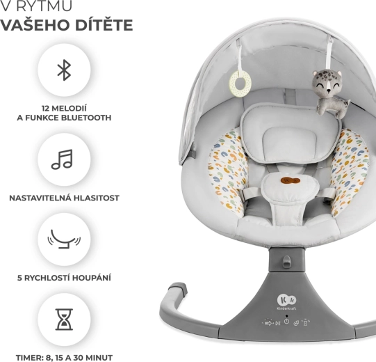 Pohyb ze strany na stranu napodobuje pocit v maminčině břiše. Tichý motorek neruší a 5 rychlostí snadno přizpůsobíte potřebám miminka.