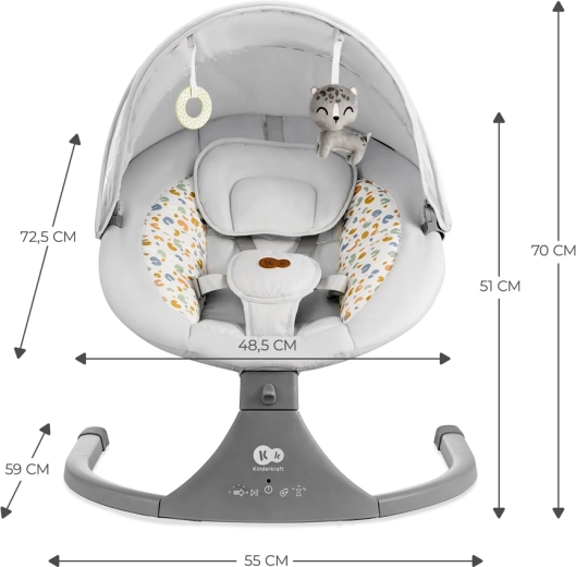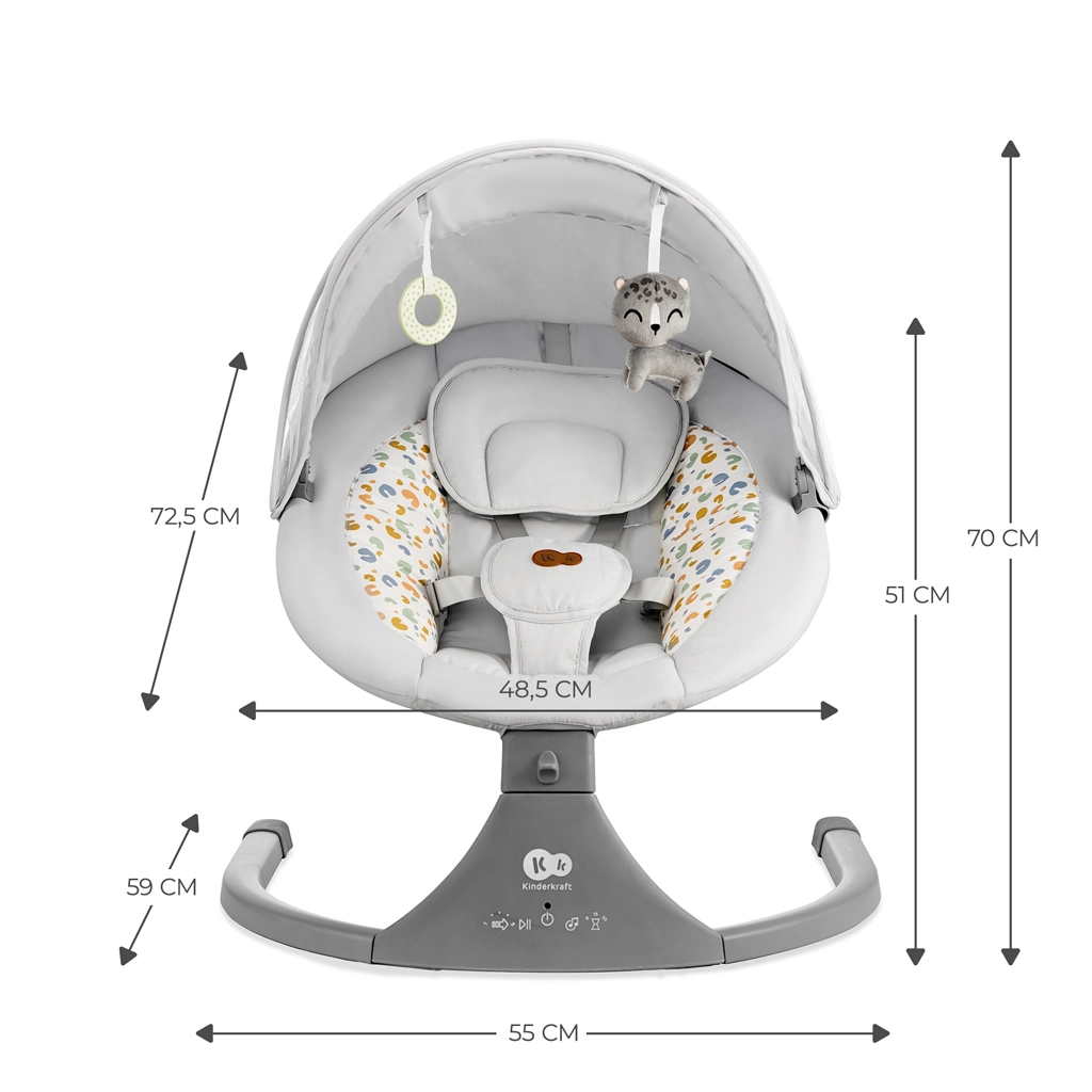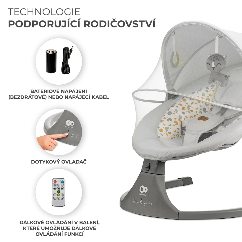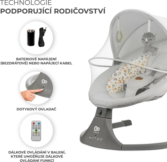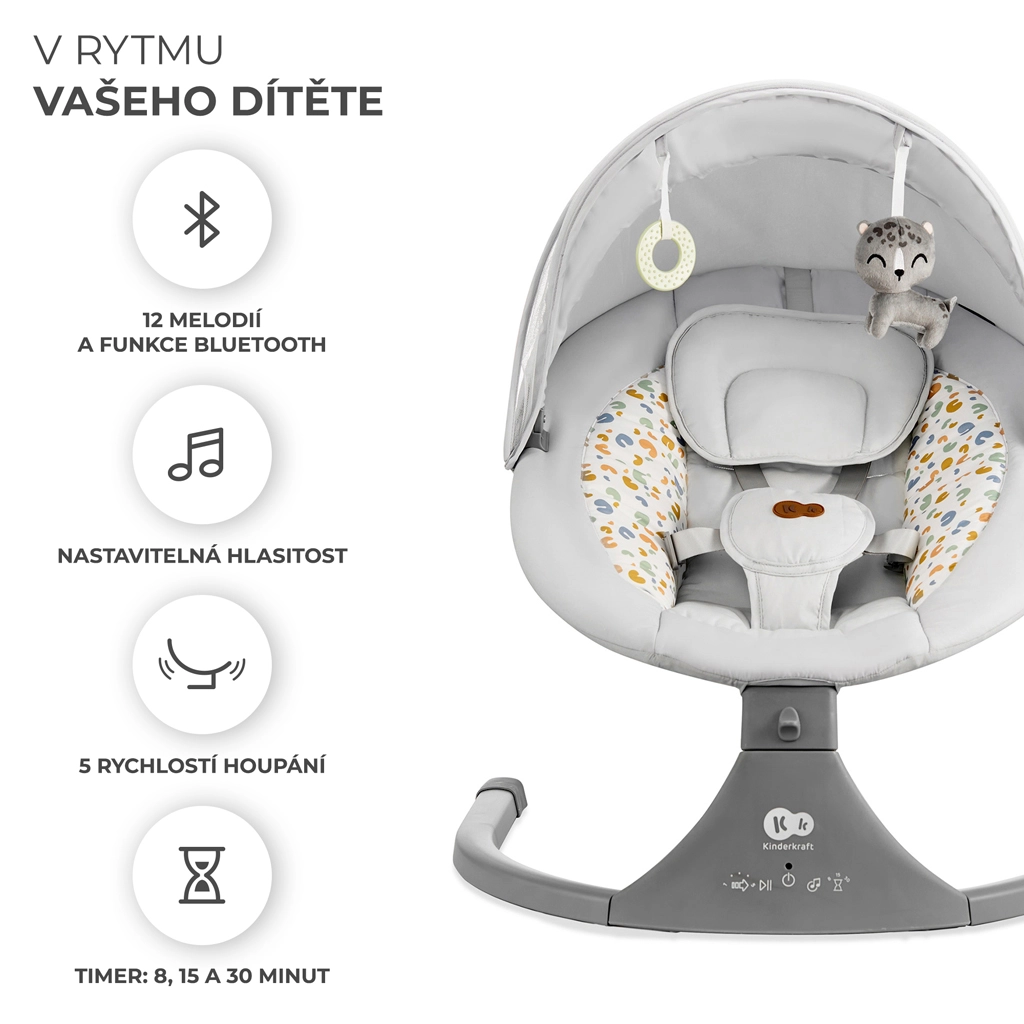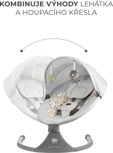 Lehátko Kinderkraft LUMI kombinuje moderní technologie a bezpečný design pro pohodlné uspávání od narození do 9 kg. Díky bočnímu houpání se miminko cítí jako v náručí, zatímco tichý motorek neruší spánek. S mobilní konektivitou Bluetooth a vstupem USB snadno pustíte oblíbené ukolébavky přímo z telefonu.