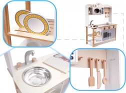 Dětská Dřevěná Kuchyně Lulilo Kuketo přináší nekonečné možnosti zábavy a rozvoje pro vaše dítě. Tato kuchyňka má realistické funkce, včetně dřezu s kohoutkem, sporáku, mikrovlnky, a úložného prostoru v podobě poliček a skříněk. Rozměry kuchyně jsou ideální pro malé děti, což umožňuje snadný přístup ke všem prvkům hračky.