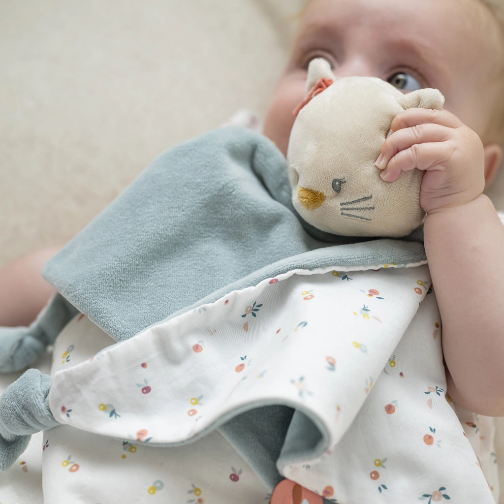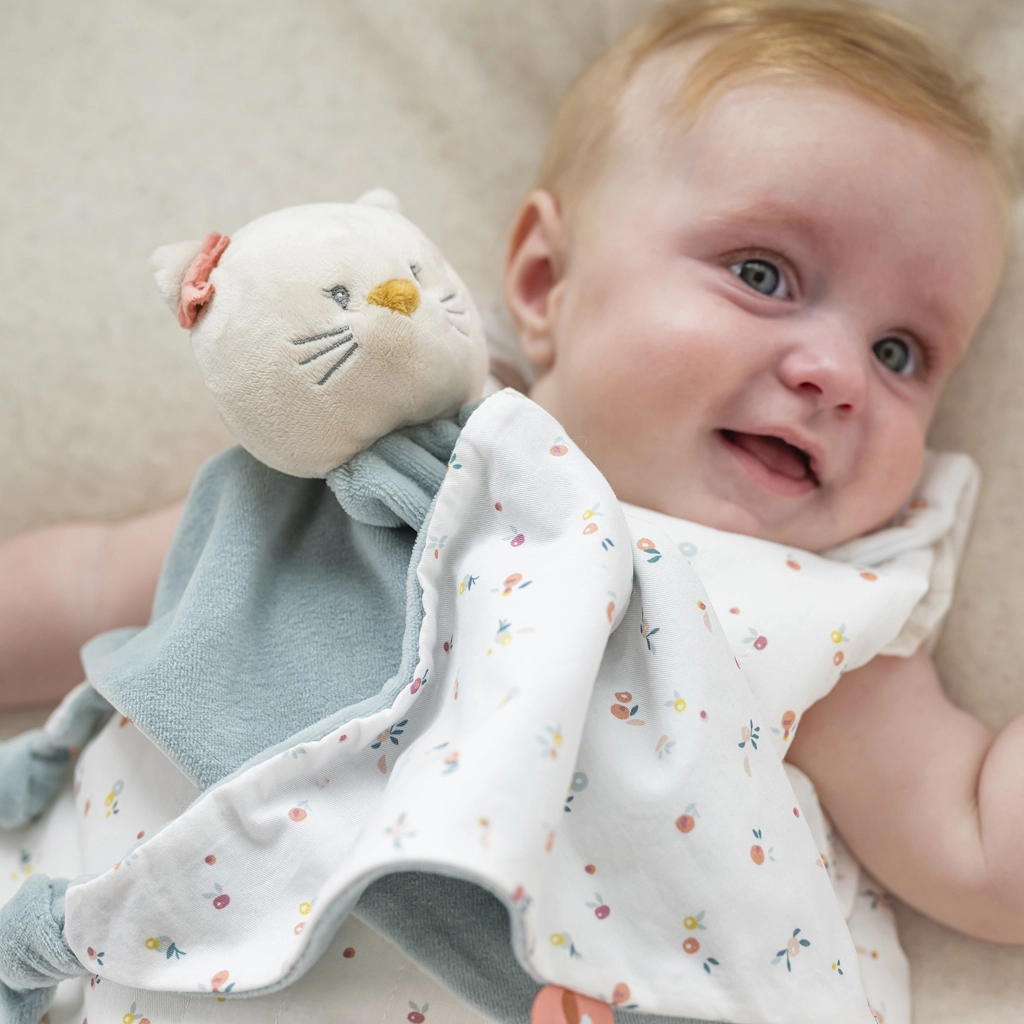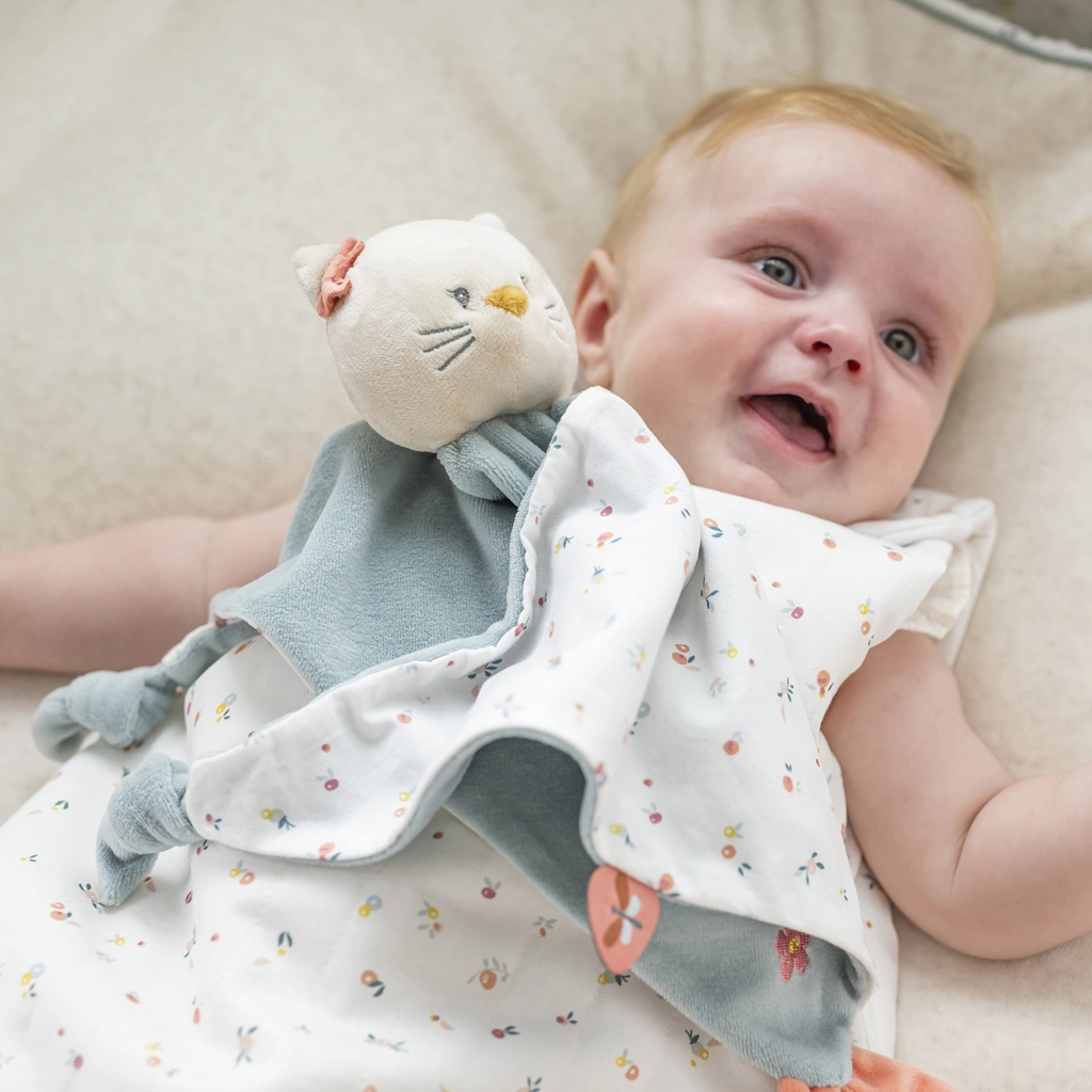 Mazlivý muchláček NATTOU s motivem kočičky Lany v maxi velikosti 65 × 40 cm je ideální parťák od narození. Nabízí ultra jemný materiál, bezpečné uzlíky pro snadné uchopení, praktický držák na dudlík a uklidňující dotyk pro klidný spánek i zábavu na cestách.
