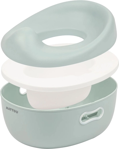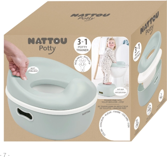 Nočník NATTOU Potty 3v1 je chytré řešení pro každou fázi učení na toaletu. Začíná jako kompaktní nočník s pohodlným sezením a zvýšenou přední částí proti prošplíchnutí. Jakmile je dítě připravené, jednoduše použijete redukci na běžné WC a k tomu stupátko, které dítěti dodá potřebnou výšku a jistotu.