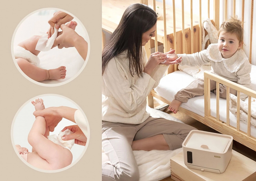 Ovládání je intuitivní přes dotykový panel s ochranou proti nechtěnému zapnutí. Díky protiskluzové základně a dlouhému napájecímu kabelu (170 cm) zařízení snadno umístíte na přebalovací pult, do koupelny i obývacího pokoje. Spodní zásuvka pojme suché ubrousky, malé obklady nebo dětské ponožky.