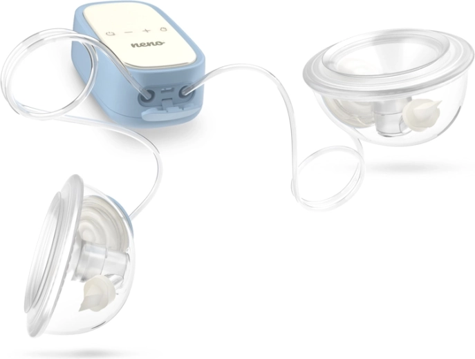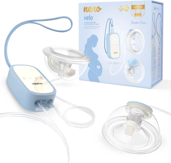 Užívejte si svobodu při kojení s odsávačkou Neno Velo – kompaktní bezdrátovou hands‑free dvojitou odsávačkou, která nabízí třífázové odsávání s 8 úrovněmi síly, jemné silikonové nástavce 24 mm s redukci na 20 mm, tichý provoz, automatické vypnutí po 30 min a až 120 minut práce na jedno nabití.