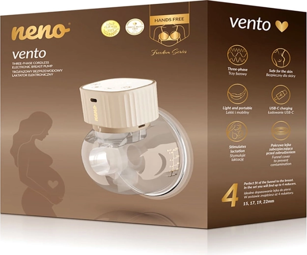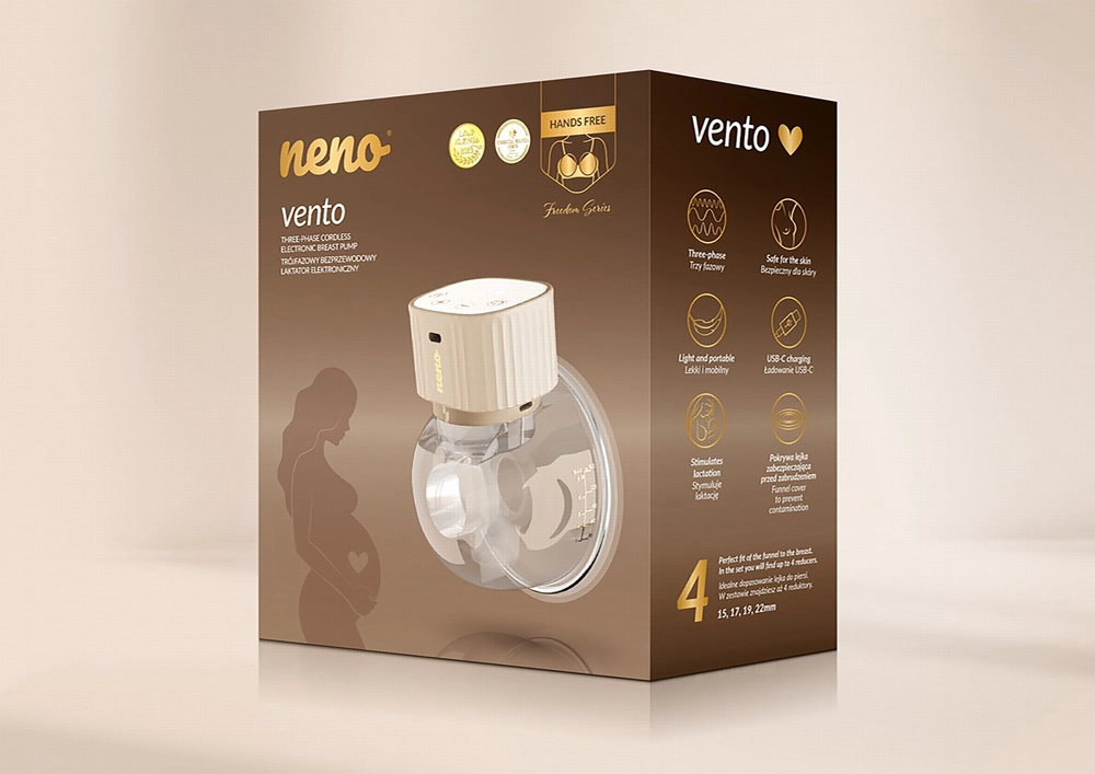 Neno Vento je moderní elektrická, nositelná odsávačka mateřského mléka navržená pro svobodu pohybu a pohodlí. Sedí přímo v podprsence, funguje zcela bez kabelů a díky tichému chodu umožňuje diskrétní odsávání kdykoli během dne i noci. Třífázová technologie sání – stimulace, hluboké odsávání a kombinovaný režim – napodobuje přirozené kojení a pomáhá účinně rozběhnout i udržet laktaci.