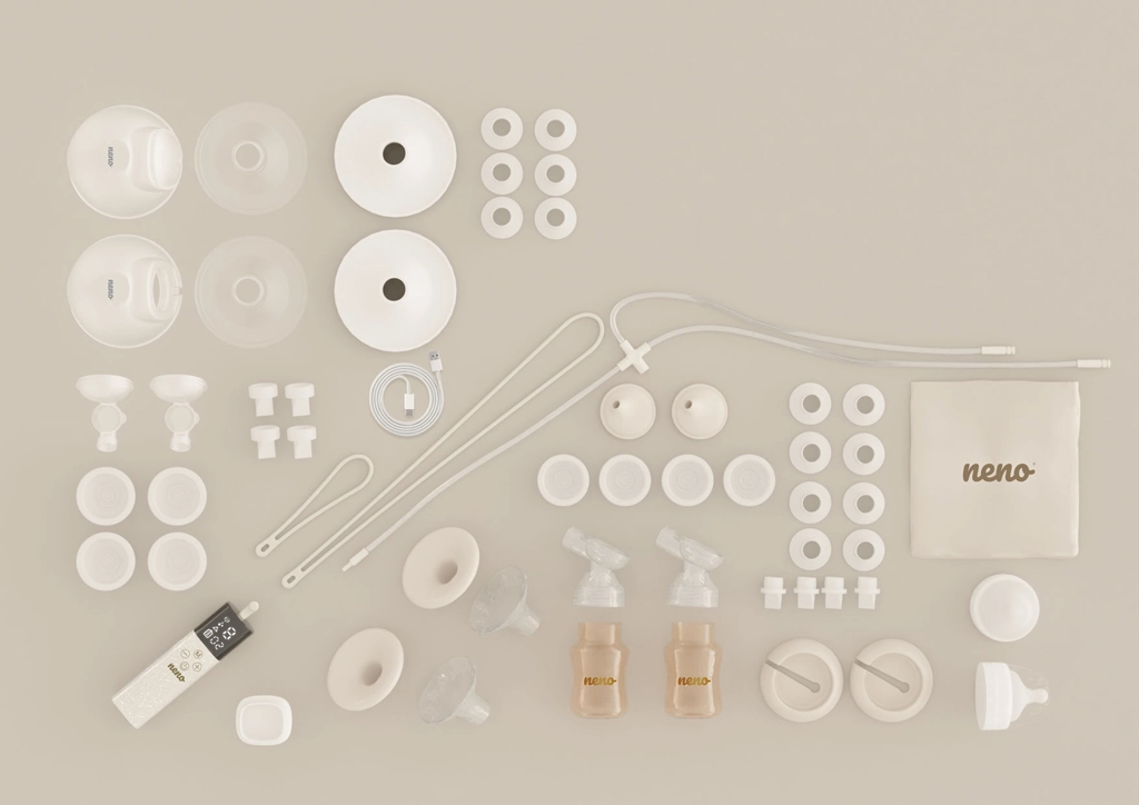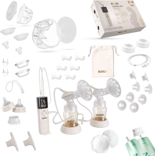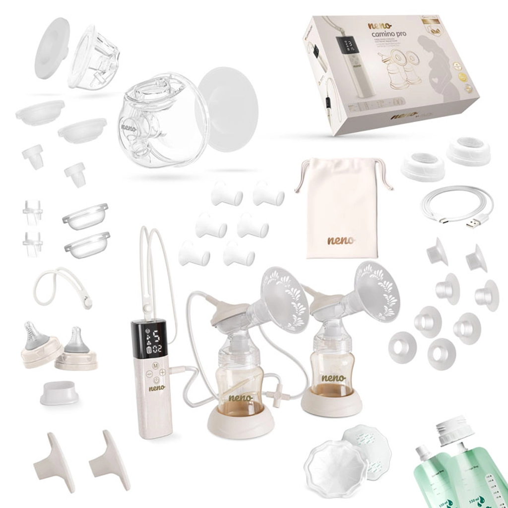- Odsavač Neno Camino Pro, stojan, USB‑C kabel, sametové pouzdro, 2× sáček na mléko, 2× kojicí vložky, 2× šňůrky (dlouhá a krátká); sada na lahvové odsávání (2× láhev 150 ml, 2× kryt štítu, 2× štít 24 mm, 2× stojánek, silikonová hadička, 4× membrána, 4× ventil, 2× konektor, 2× sada redukcí 15/17/19/22 mm, 2× uzávěr láhve s konektorem); sada na hands‑free sběr (2× nádoba 240 ml, 2× konektory, 2× kryty membrán, 4× membrány, 2× štíty 24 mm, 4× ventily, 2× kryty štítů, 2× sady redukcí 17/19/21 mm)