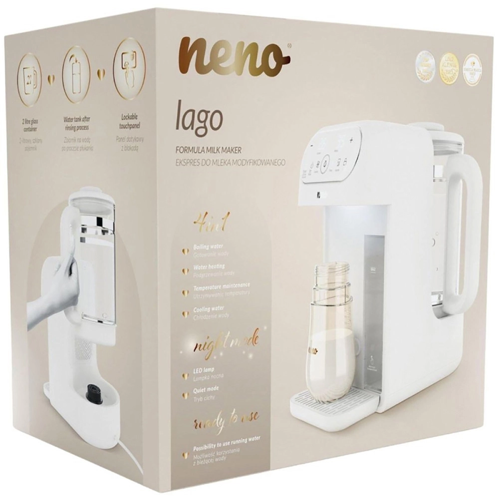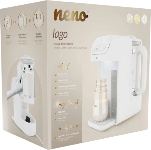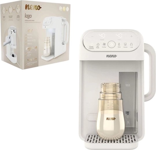Neno Lago je spolehlivý pomocník pro rodiče, kteří chtějí připravit kojenecké mléko rychle, bezpečně a bez stresu. Automaticky dávkuje vodu v požadovaném množství a udržuje ji na ideální teplotě, takže lahvičku připravíte během pár okamžiků – skvělé zejména v noci.
