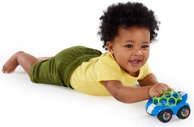 Modré chrastící autíčko OBALL Rattle & Roll probouzí zvídavost a rozvíjí smysly. Díky pružné mřížce OBALL jej děti snadno uchopí, zatřesou a rozjedou. Průhledná kolečka se širokými komorami ukrývají barevné kuličky, které při pohybu vytvářejí zábavný zvuk – motivují k plazení, lezení i prvním krůčkům.