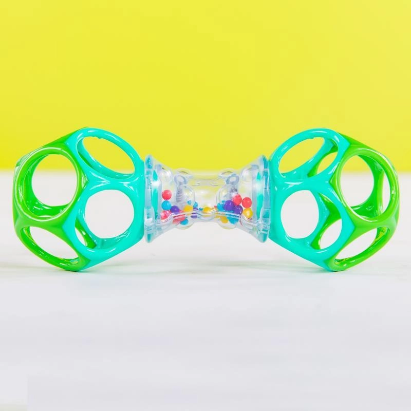Ikonické chrastítko OBALL ve tvaru činky kombinuje snadné uchopení, jemné zvukové podněty a bezpečné kousání v jednom. Otevřená mřížková struktura konců pomáhá dětem rozvíjet úchop, zatímco průhledný střed s barevnými kuličkami motivuje k pohybu a objevování. Hračka je extrémně odolná, přitom lehká a šetrná k dásním.