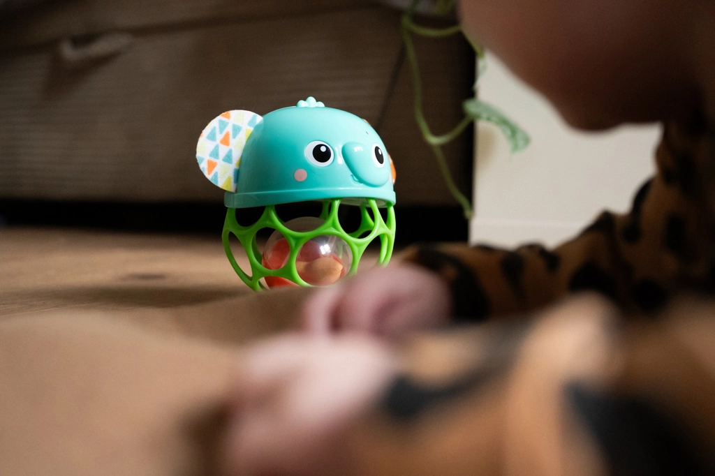 Otevřená mřížková konstrukce s množstvím děr je ideální pro malé prstíky. Lehký materiál podporuje samostatné uchopení a třesení bez námahy.